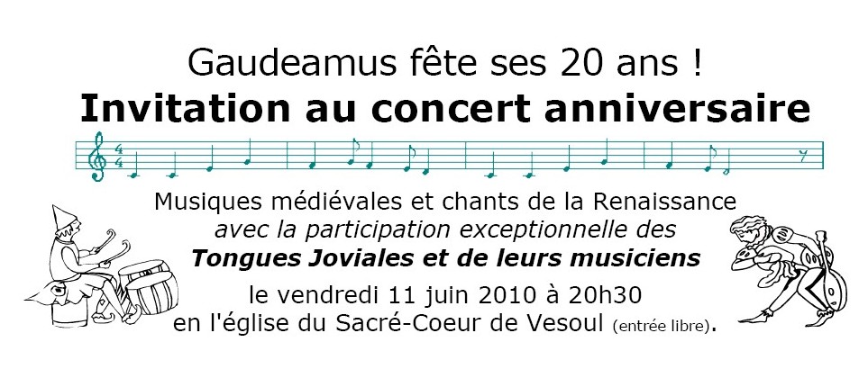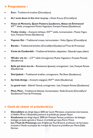 simus concanentes La chorale est en vacances !Le concert du 11 juin a constitué l'aboutissement du travail de ce semestre. Les répétitions reprendront en septembre. Pour l'équilibre des pupitres nous serons heureux de recruter quelques Alti ainsi que des hommes. On en parle sur le WebUn article qui parle du concert du 11 juin sur Come 4 News 11 juin 2010 - Concert anniversaireLe